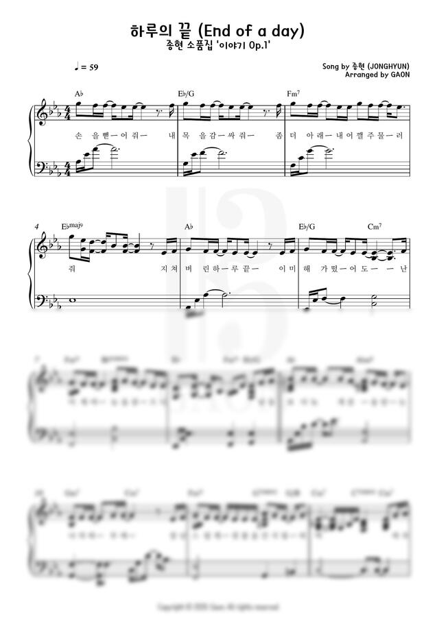 악보 게시판 > 종현 (JONGHYUN) - 하루의 끝 (End of a day) (중급 악보) by 가온